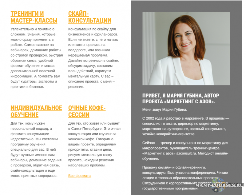 Вы находитесь на странице товара «Мария Губина - Маркетинг с азов 5.0», это материал 2021 года, который, мы надеемся, принесет вам пользу. Скриншоты с платформы на которой расположены материалы вы можете найти выше. В нашем магазине курсы доступны по самым выгодным ценам. Вы можете перейти на оригинальный продажник, после чего принять решение о покупке. Если бы вы покупали у самого автора, то данный курс вам обошелся 10900 рублей. Вы получаете этот курс, купив в нашем магазине MANY-COURSES.NET, с огромной скидкой, всего 99 рублей. Обучающий курс входит в рубрику «SEO и SMM / Бизнес, менеджмент, продажи», вы можете поискать другие сливы курсов в этой рубрике. В нашем магазине Вы найдёте ещё много курсов от автора «Мария Губина», достаточно ввести в поиск имя автора.