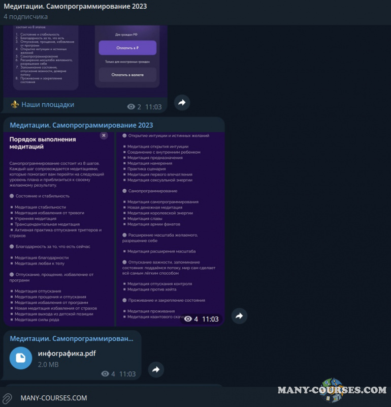 Вы находитесь на странице товара «Ab.money / Александра Белякова - Медитации. Самопрограммирование (2023)», это материал 2023 года, который, мы надеемся, принесет вам пользу. Данный курс расположен на платформе «Канал Telegram».Скриншоты с платформы на которой расположены материалы вы можете найти выше. В нашем магазине курсы доступны по самым выгодным ценам. Вы можете перейти на оригинальный продажник, после чего принять решение о покупке. Если бы вы покупали у самого автора, то данный курс вам обошелся 66666 рублей. Вы получаете этот курс, купив в нашем магазине MANY-COURSES.NET, с огромной скидкой, всего 490 рублей. Обучающий курс входит в рубрику «Курсы от Александры Беляковой / Эзотерика и оккультизм / Медитации», вы можете поискать другие сливы курсов в этой рубрике. В нашем магазине Вы найдёте ещё много курсов от автора «Александра Белякова», достаточно ввести в поиск имя автора.