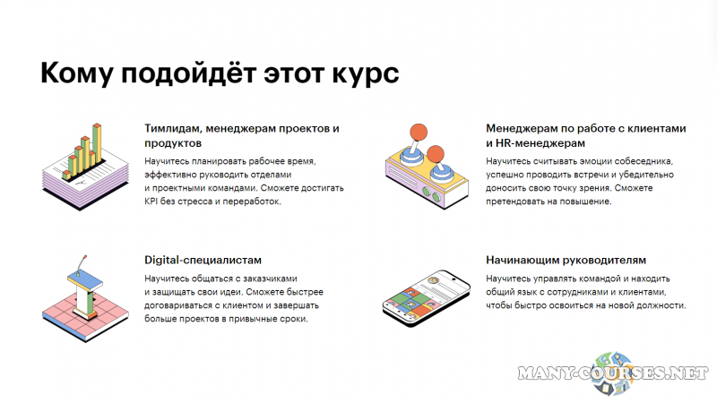Научитесь планировать рабочее время, эффективно руководить отделами и проектными командами. Сможете достигать KPI без стресса и переработок.