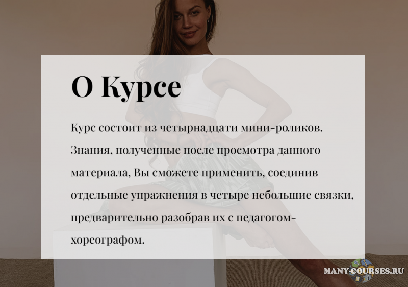 Курс состоит из четырнадцати мини-роликов. Знания, полученные после просмотра данного материала, Вы сможете применить, соединив отдельные упражнения в четыре небольшие связки, предварительно разобрав их с педагогом-хореографом.