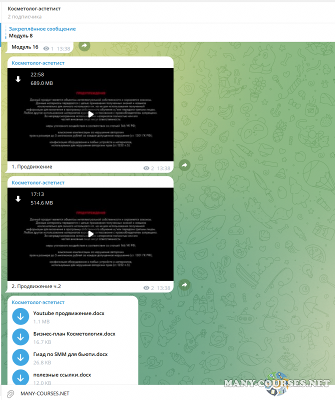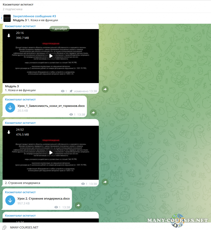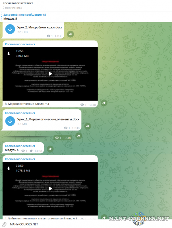 Вы находитесь на странице товара «Анастасия Ларина - Косметолог-эстетист. Тариф Стандарт», это материал 2023 года, который, мы надеемся, принесет вам пользу. Данный курс расположен на платформе «Канал Telegram».Скриншоты с платформы на которой расположены материалы вы можете найти выше. В нашем магазине курсы доступны по самым выгодным ценам. Вы получаете этот курс, купив в нашем магазине MANY-COURSES.NET, с огромной скидкой, всего 1490 рублей. Обучающий курс входит в рубрику «Стиль и имидж», вы можете поискать другие сливы курсов в этой рубрике. В нашем магазине Вы найдёте ещё много курсов от автора «Анастасия Ларина», достаточно ввести в поиск имя автора.