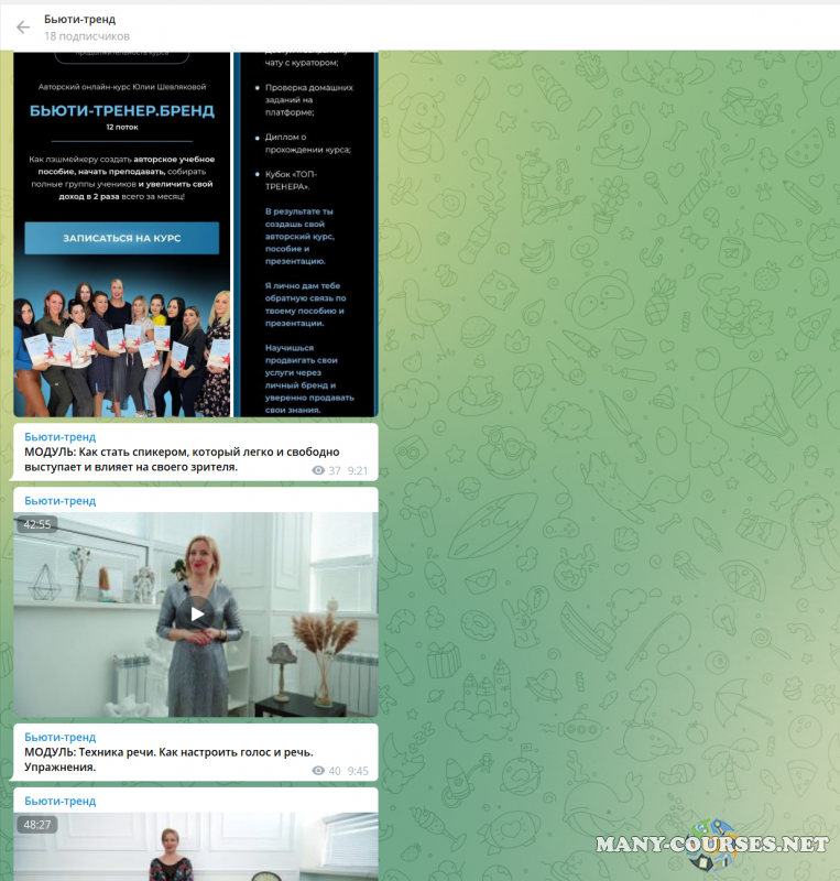 Вы находитесь на странице товара «Юлия Шевлякова - Бьюти-тренер. Бренд. Тариф Топ-тренер. Gold (2024)», это материал 2024 года, который, мы надеемся, принесет вам пользу. Данный курс расположен на платформе «Канал Telegram».Скриншоты с платформы на которой расположены материалы вы можете найти выше. В нашем магазине курсы доступны по самым выгодным ценам. Вы можете перейти на оригинальный продажник, после чего принять решение о покупке. Если бы вы покупали у самого автора, то данный курс вам обошелся 63990 рублей. Вы получаете этот курс, купив в нашем магазине MANY-COURSES.NET, с огромной скидкой, всего 1690 рублей. Обучающий курс входит в рубрику «Стиль и имидж», вы можете поискать другие сливы курсов в этой рубрике. В нашем магазине Вы найдёте ещё много курсов от автора «Юлия Шевлякова», достаточно ввести в поиск имя автора.