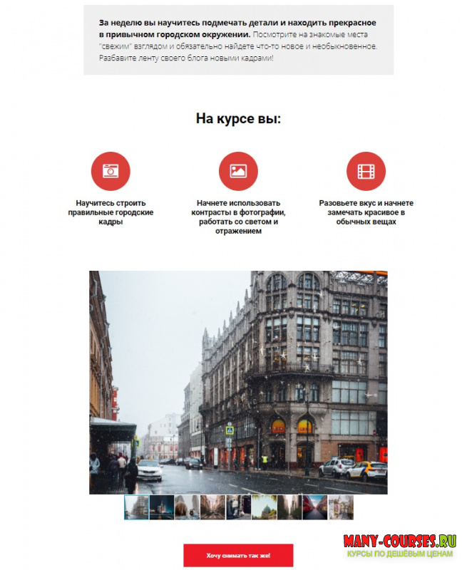 Вы находитесь на странице товара «Izibizi / Светлана Зарламова - Марафон по фотосъемке городских пейзажей «Фото в городе» (2021)», это материал 2021 года, который, мы надеемся, принесет вам пользу. Скриншоты с платформы на которой расположены материалы вы можете найти выше. В нашем магазине курсы доступны по самым выгодным ценам. Вы можете перейти на оригинальный продажник, после чего принять решение о покупке. Если бы вы покупали у самого автора, то данный курс вам обошелся 990 рублей. Вы получаете этот курс, купив в нашем магазине MANY-COURSES.NET, с огромной скидкой, всего 99 рублей. Обучающий курс входит в рубрику «Видео и фото», вы можете поискать другие сливы курсов в этой рубрике. В нашем магазине Вы найдёте ещё много курсов от автора «Izibizi / Светлана Зарламова», достаточно ввести в поиск имя автора.