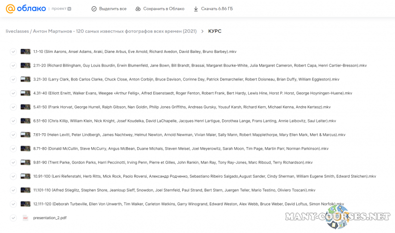 Вы находитесь на странице товара «liveclasses / Антон Мартынов - 120 самых известных фотографов всех времен (2021)», это материал 2021 года, который, мы надеемся, принесет вам пользу. Скриншоты с платформы на которой расположены материалы вы можете найти выше. В нашем магазине курсы доступны по самым выгодным ценам. Вы получаете этот курс, купив в нашем магазине MANY-COURSES.NET, с огромной скидкой, всего 70 рублей. Обучающий курс входит в рубрику «Видео и фото», вы можете поискать другие сливы курсов в этой рубрике. В нашем магазине Вы найдёте ещё много курсов от автора «Антон Мартынов», достаточно ввести в поиск имя автора.