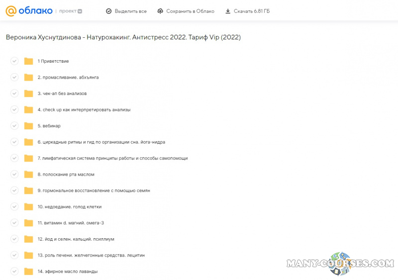 Вы находитесь на странице товара «Вероника Хуснутдинова - Натурохакинг. Антистресс 2022. Тариф Vip», это материал 2022 года, который, мы надеемся, принесет вам пользу. Данный курс расположен на платформе «Облако Mail».Скриншоты с платформы на которой расположены материалы вы можете найти выше. В нашем магазине курсы доступны по самым выгодным ценам. Вы можете перейти на оригинальный продажник, после чего принять решение о покупке. Если бы вы покупали у самого автора, то данный курс вам обошелся 16900 рублей. Вы получаете этот курс, купив в нашем магазине MANY-COURSES.NET, с огромной скидкой, всего 400 рублей. Обучающий курс входит в рубрику «Здоровье и Спорт», вы можете поискать другие сливы курсов в этой рубрике. В нашем магазине Вы найдёте ещё много курсов от автора «Вероника Хуснутдинова», достаточно ввести в поиск имя автора.