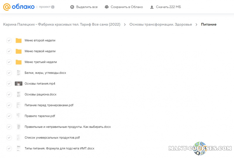 Вы находитесь на странице товара «Карина Палецких - Фабрика красивых тел. Тариф Все сама», это материал 2022 года, который, мы надеемся, принесет вам пользу. Данный курс расположен на платформе «Облако Mail».Скриншоты с платформы на которой расположены материалы вы можете найти выше. В нашем магазине курсы доступны по самым выгодным ценам. Вы получаете этот курс, купив в нашем магазине MANY-COURSES.NET, с огромной скидкой, всего 249 рублей. Обучающий курс входит в рубрику «Здоровье и Спорт / Саморазвитие и мотивация», вы можете поискать другие сливы курсов в этой рубрике. В нашем магазине Вы найдёте ещё много курсов от автора «Карина Палецких», достаточно ввести в поиск имя автора.