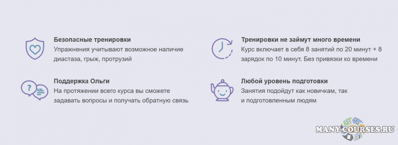 - 8 занятий по 20 минут + 8 зарядок по 10 минут.